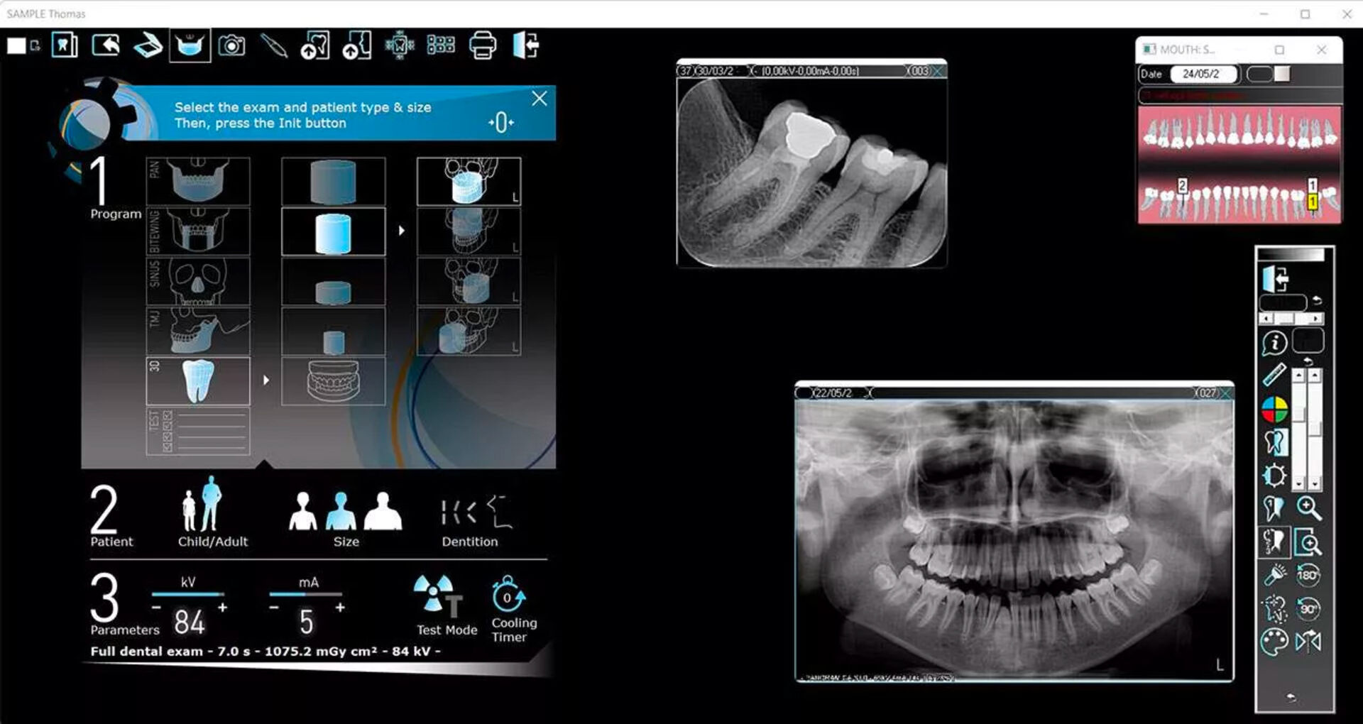 Il propose 24 programmes 2D adaptés aux adultes comme aux enfants (panoramique standard, bitewing, hemi-panoramique, sinus, ATM…), assurant une prise en charge complète des examens courants.